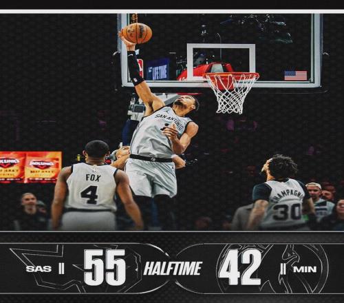 馬刺榜眼哈珀最近狀態(tài)不佳,過去4場(chǎng)比賽場(chǎng)均4.3分2.3助攻,投籃命中率只有21.9%(32投7中)。說回比賽,馬刺開局轟出16-0的攻擊波。森林狼主場(chǎng)球迷有個(gè)傳統(tǒng),主隊(duì)進(jìn)球后才會(huì)坐下。開場(chǎng)打了4分40秒,森林狼終于得分了。