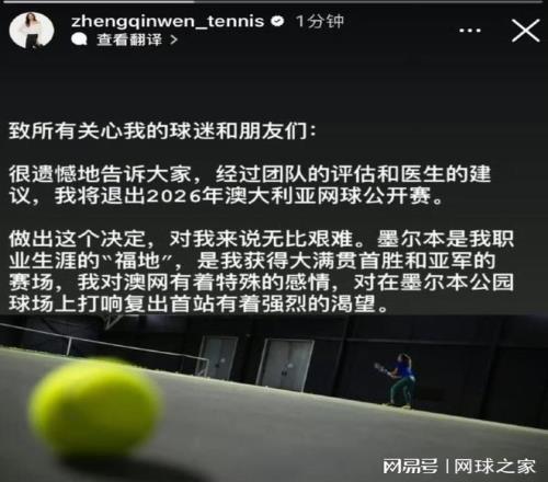 早在中國球員陸續(xù)公布2026賽季參賽計劃時,唯獨沒有看到鄭欽文公布新賽季參賽計劃,很多人就已經(jīng)猜測,她最終缺席2026澳網(wǎng)的可能性比較大。