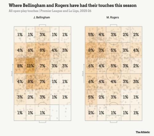 貝林厄姆尚未找回他在2023-24賽季的進攻巔峰狀態(tài)——當時他在28場西甲比賽中打進19球。上賽季他僅有9球入賬,本賽季至今也只有4球,不過這其中存在一些客觀因素。他因肩傷恢復而推遲開啟賽季,同時從下方觸球熱區(qū)圖可以看出,他承擔了比羅杰斯更多的防守任務,在進攻三區(qū)的觸球比例低了11個百分點。